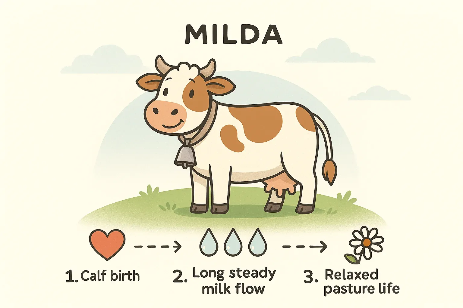 Milda was born to a cow selected not just for high milk yield, but for lactation persistency—the ability to keep producing milk steadily for well over a year, without needing another pregnancy. Her DNA has been handpicked (by genomics nerds with spreadsheets and AI tools) to give her a flat, stable lactation curve. Not too peaky, not too short. Just steady, like a solar panel in cow form.[7:2][8:1]